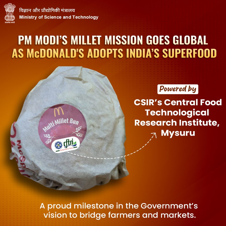 The announcement was made by Union Minister of Science and Technology Dr. Jitendra Singh on X (formerly Twitter), who described it as a “moment of pride for Indian innovation.” He posted a photo of the burger, which showed packaging marked with a “Multi-Millet Bun” sticker, emphasising the partnership between Indian scientific innovation and global business.